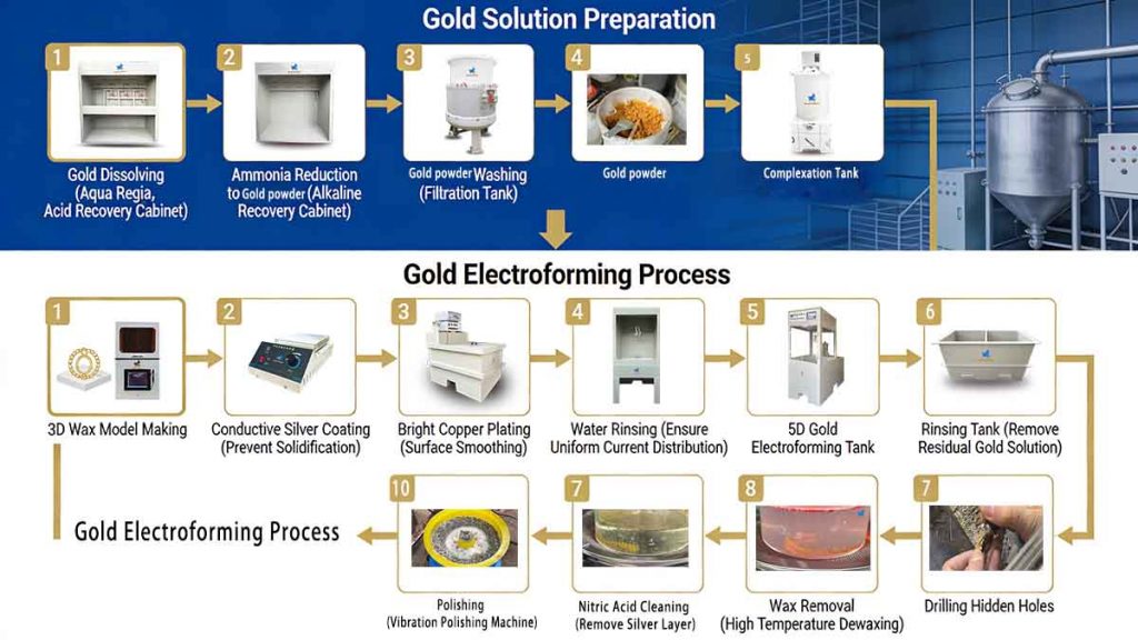 The complete process is divided into two main stages, ensuring both high-purity gold preparation and high-quality electroformed products.